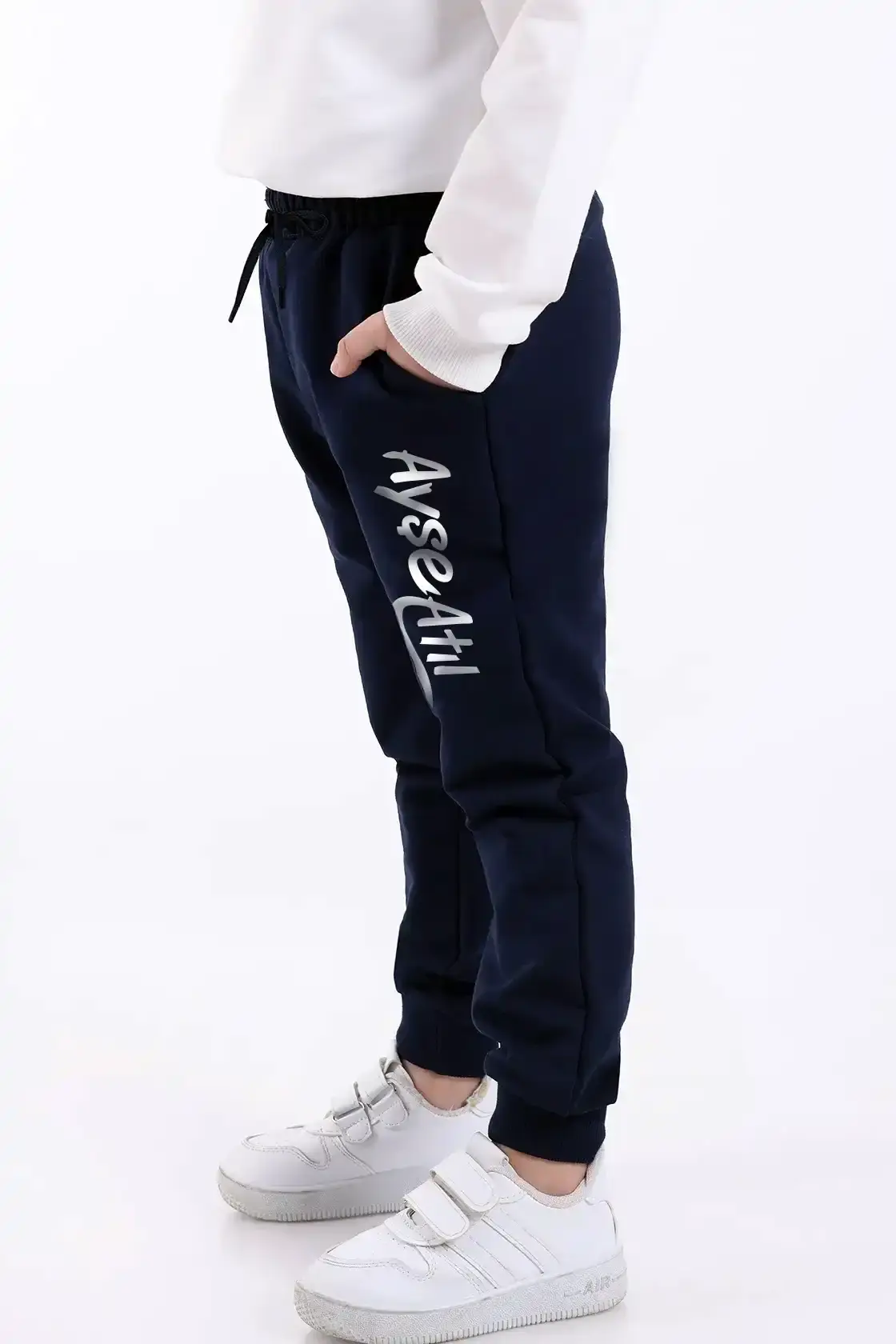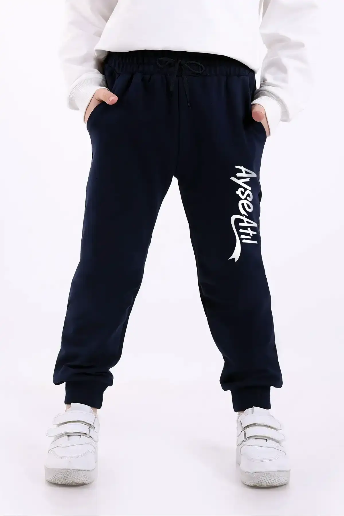 Yan cepleri sayesinde çocuklar küçük eşyalarını güvenle yanında taşıyabilir. Lacivert rengi sayesinde okul kıyafet kodlarına uygundur ve her üst giyim parçasıyla kolaylıkla kombinlenebilir. Üzerinde yer alan beyaz renkteki “Ayşe Atıl” yazısı, sade ama dikkat çekici bir tasarımla eşofmana modern bir hava katmaktadır. Bu tip grafik detaylar, çocukların kıyafeti severek giymelerini sağlar ve okula olan aidiyet duygularını da güçlendirir.