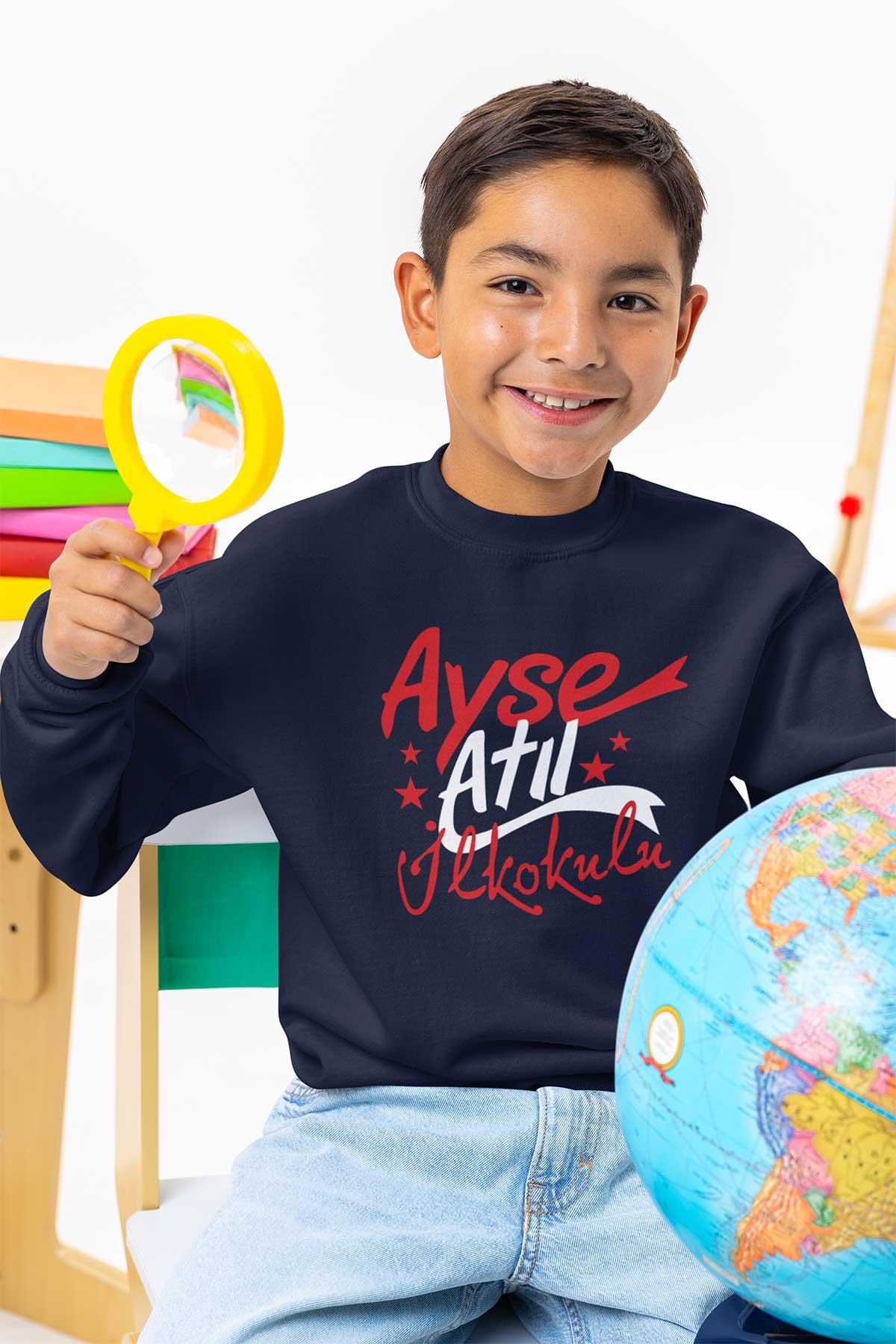 Tasarımında sadelik ve şıklık bir araya getirilmiştir. Lacivert zemin üzerine kırmızı ve beyaz renklerle tasarlanmış “Ayşe Atıl İlkokulu” yazısı modern bir tipografiyle işlenmiştir. Yazının etrafını saran yıldız detayları, tişörte enerjik bir görünüm kazandırır. Çocuğunuz bu sweatshirt’ü yalnızca okulda değil, sosyal etkinliklerde, hafta sonu gezilerinde ya da günlük kullanımda da keyifle giymek isteyecektir.