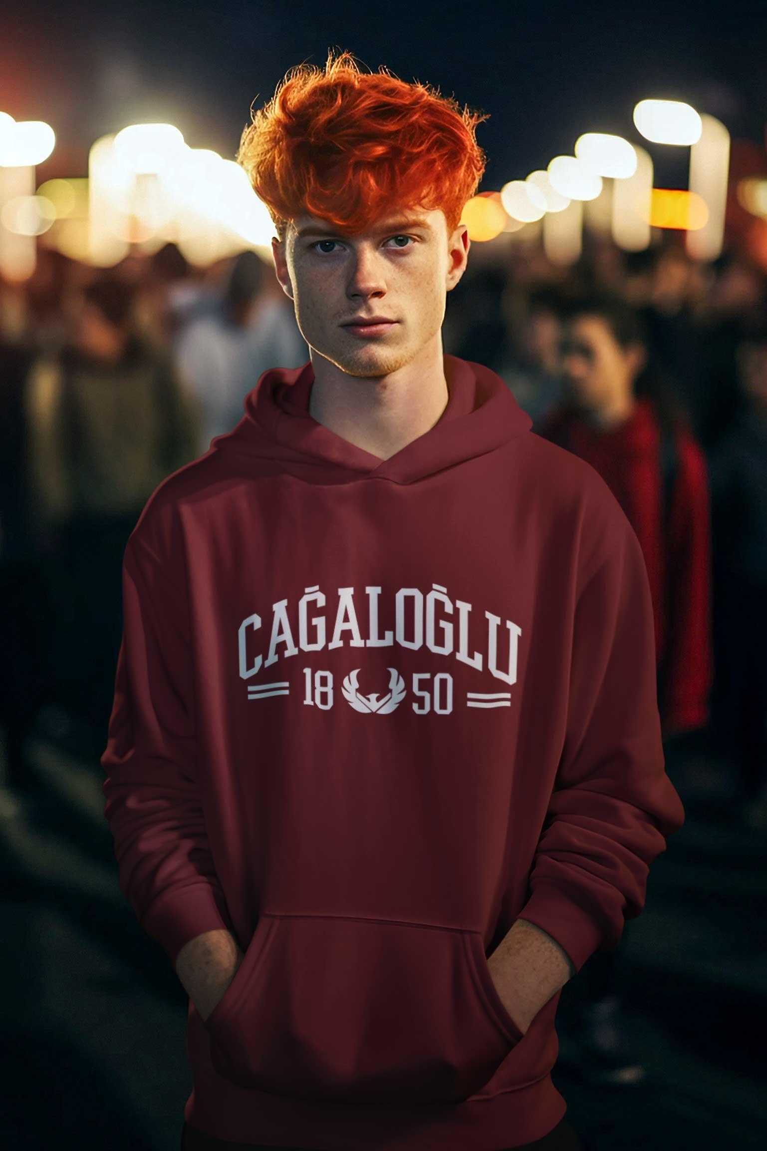 Bordo renk, modanın en asil ve enerjik tonlarından biridir. Siyah ve beyazla kolayca kombinlenebilen bordo hoodie, gençlerin tarzına şıklık katar. Göğüs kısmındaki “Çağaloğlu 1850” baskısı, okulun tarihi mirasını temsil ederken modern tipografiyle günümüzün genç moda anlayışına uyarlanmıştır. Baskının altındaki defne yaprağı sembolü başarıyı ve güçlü bir duruşu simgeler.