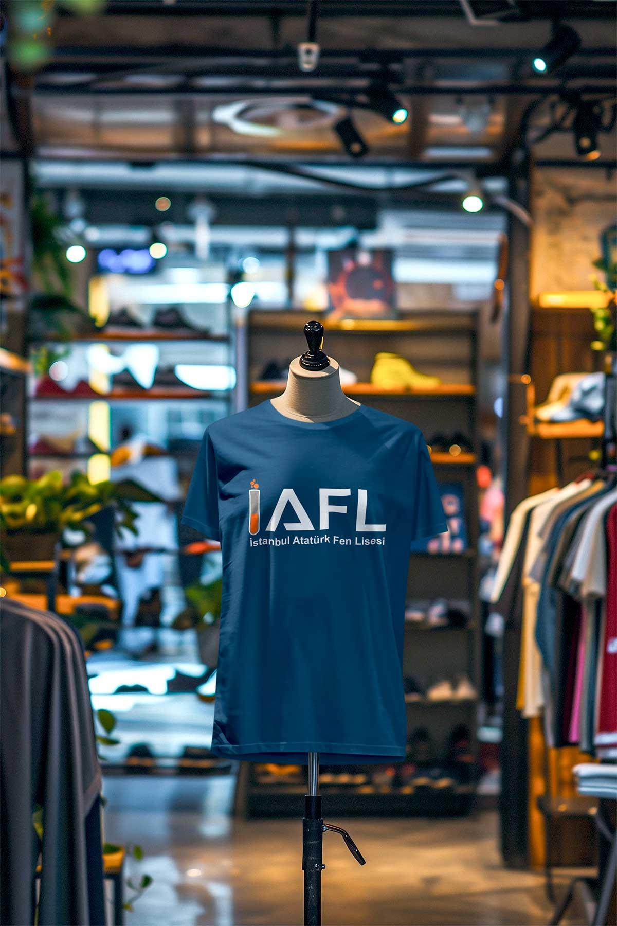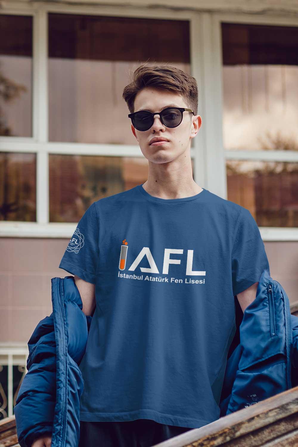 Tişörtün tam ön kısmında yer alan “IAFL” logosu, dikkat çekici geometrik fontuyla güçlü bir duruş sergilerken, “i” harfinin içinde yer alan turuncu renkli deney tüpü simgesiyle bilim vurgusu ön plana çıkıyor. “İstanbul Atatürk Fen Lisesi” yazısı sade ve okunaklı bir tipografiyle alt kısımda konumlanmıştır. Ayrıca sol kolda yer alan bilim temalı IAFL amblemi, tasarıma derinlik ve karakter katıyor.
