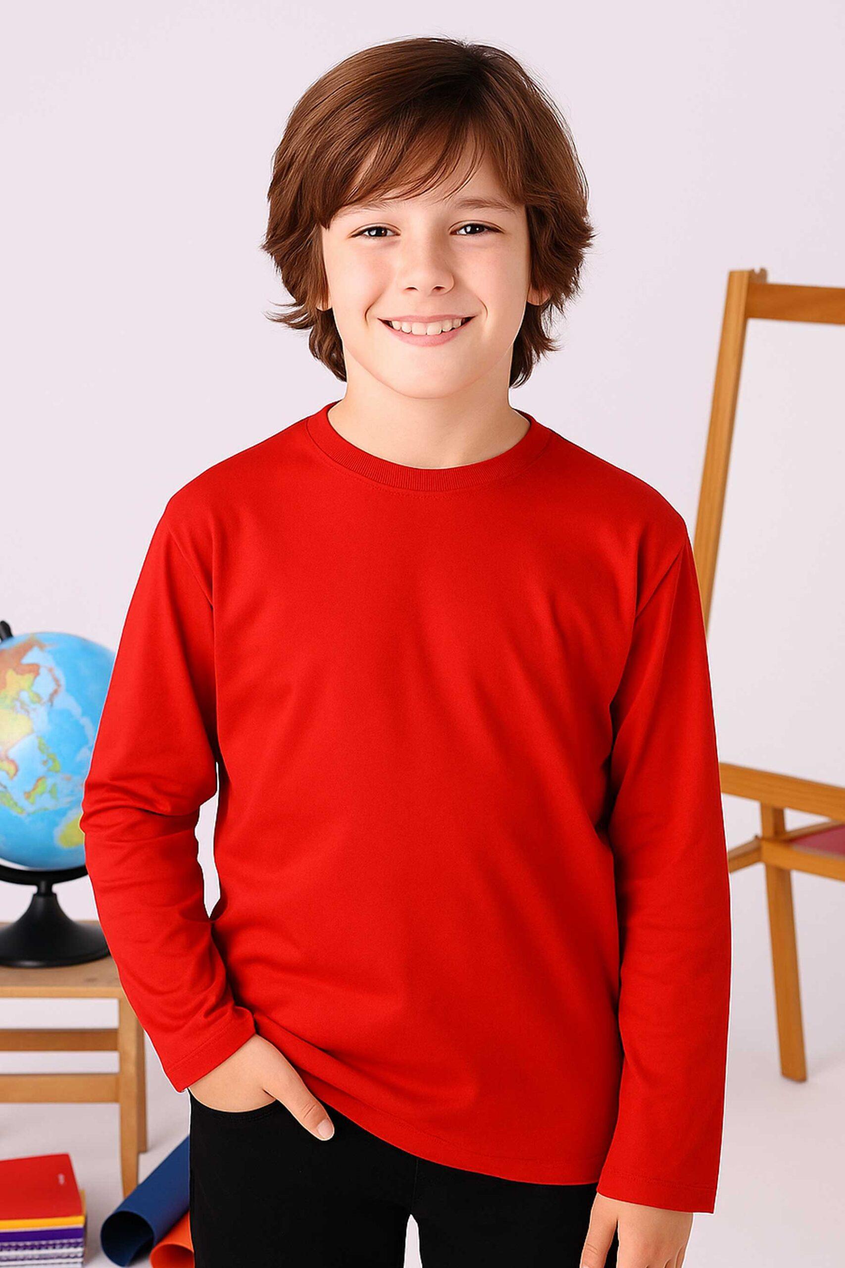Kırmızı Sıfır Yaka Baskısız Premium Unisex Çocuk Uzun Kollu Tişört – Yönetmeliğe Uygun, Konforlu ve Dayanıklı