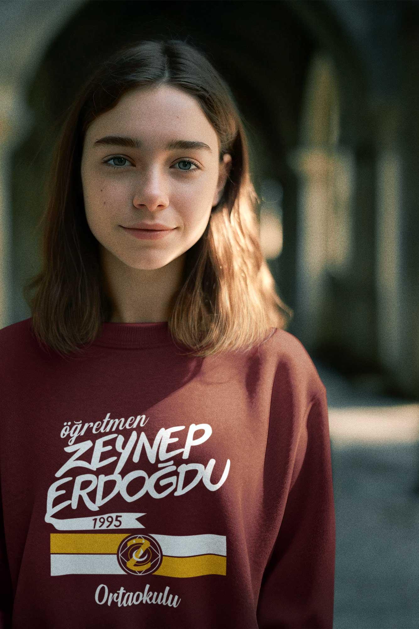 Sweatshirt’ün ön yüzünde modern ve enerjik bir yazı tipiyle "Öğretmen Zeynep Erdoğdu – 1995 – Ortaokulu" yazısı dikkat çekiyor. Altındaki sarı-beyaz şeritler ve ortalanmış okul logosu tasarıma dinamizm katarken, okulun geçmişine saygı duruşunda bulunuyor. Hem estetik hem de anlamlı bir görünüm sunuyor.