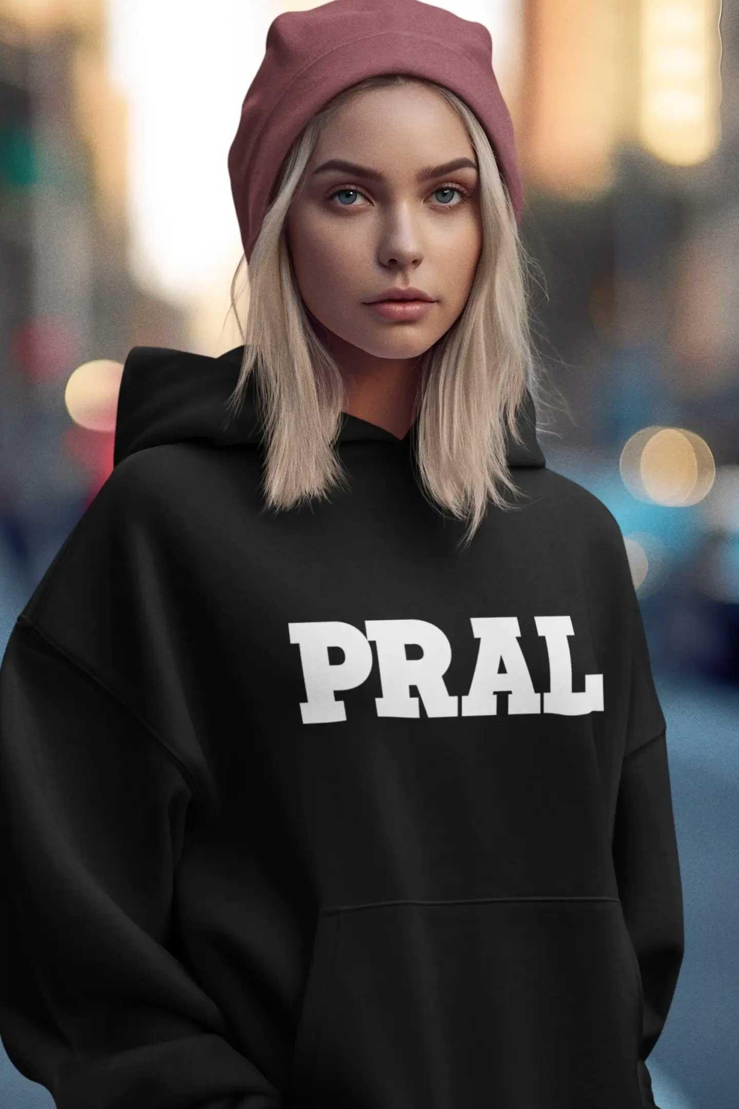 PRAL için özel olarak üretilen siyah kapüşonlu sweatshirt, günlük kullanıma uygun rahat kalıbı ve modern tasarımıyla öne çıkar.