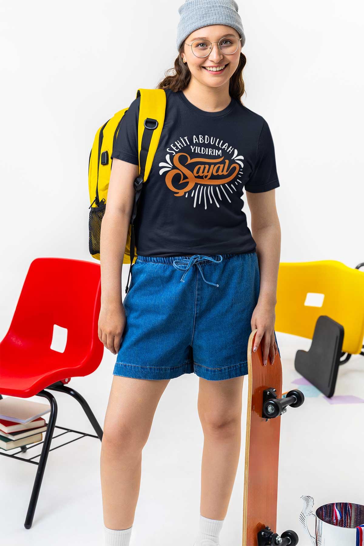 Tişörtün tam ortasında yer alan “Şehit Abdullah Yıldırım Sayal” yazısı, gençliğin dinamizmini yansıtan bir tipografiyle tasarlandı. Turuncu ve beyazın enerjisi, lacivert zeminde adeta parlıyor. Bu yazı ne çok abartılı ne de çok sade… Okul kurallarına uygun ama aynı zamanda seni farklı kılan bir tasarım detayı! Seni klasik okul tişörtlerinden ayıran detay tam da bu!