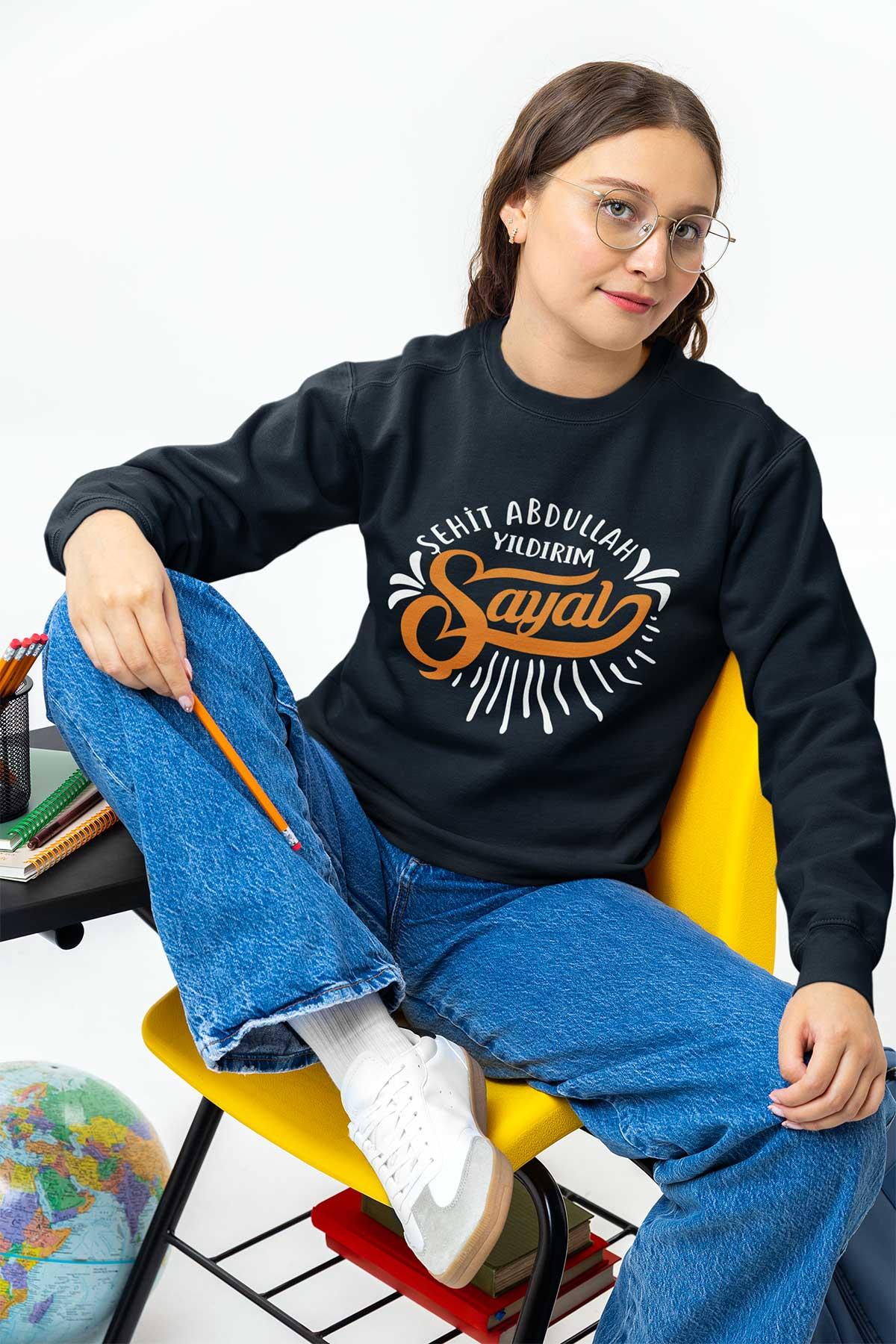 Sweatshirtün göğüs kısmında yer alan “Şehit Abdullah Yıldırım Sayal” yazısı, enerjik ve genç bir tipografiyle tasarlandı. Turuncu ve beyaz renk geçişleriyle modern bir hava katarken okulun adını gururla taşımanı sağlar. Ne çok klasik ne de fazla abartılı… Tam kararında! Okul kurallarına uygun ama aynı zamanda sokak modasına da göz kırpan bu tasarım, seni sıradan okul kıyafetlerinden sıyırıp bir adım öne çıkarır.