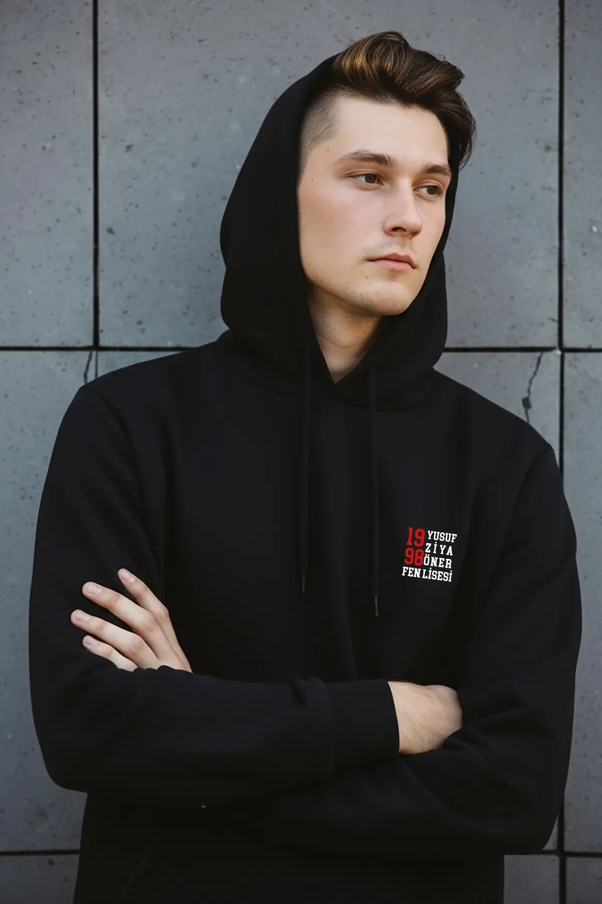 Yusuf Ziya Öner Fen Lisesi öğrencileri için tasarlanan bu siyah kapüşonlu hoodie, sade ve modern tasarımıyla okul kimliğini stil sahibi bir şekilde yansıtır. Göğüs kısmında yer alan 1998 – Yusuf Ziya Öner Fen Lisesi baskısı, okulun kuruluş yılını minimal bir tasarım anlayışıyla vurgular.